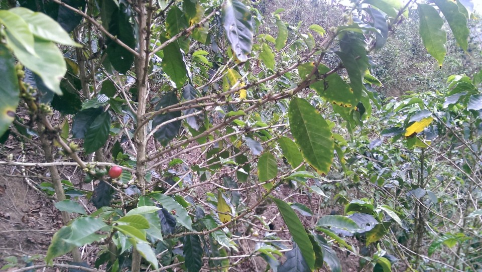 die Erntezeit ist bereits vorüber, aber eine reife rote Kaffeebohne ist zu erkennen
