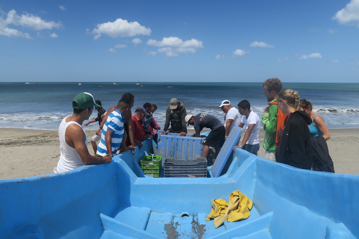 alle helfen und sind gespannt bei der Ankunft der Fischer